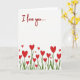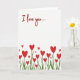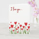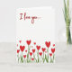 This greeting card features a white background with a sweet message and a simple garden scene. Near the top, the text reads “I love you...” in red script that looks like handwriting, with a few uneven strokes that make it feel personal. The three dots at the end add a gentle pause, like the message could keep going. Along the bottom edge, a row of heart-shaped flowers grows upward on thin green stems. The hearts are red, in slightly different sizes and heights, and they form a neat border like a little field of love. The mix of red hearts and green stems against the white space keeps the focus on romance and affection ❤️