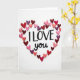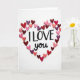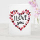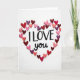 This card shows the words “I LOVE you” in black, written in a loose handwritten style at the center of a white background. Around the message is a large heart shape made from many small hearts instead of one single outline. The little hearts look like soft cutouts and come in shades of red, dark red, pink, coral, and purple. They sit close together to form a full border, giving the main heart a cozy, caring look. The simple white space keeps your eyes on the message and the colorful heart frame. Overall, it feels like a sweet note meant for someone special, with a calm and loving mood 💘❤️. Share it to help someone feel cared for this Valentine’s Day.