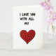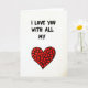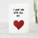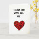 This card shows a white background with the message “I LOVE YOU WITH ALL MY” written across the top in black letters that look slightly uneven, like they were drawn by hand. The letters are thick and easy to read, and the words sit centered near the upper half of the front. Under the text is a large red heart that finishes the thought without needing more words ❤️. Inside that big heart, you can see many tiny, irregular heart shapes packed together, each one outlined in black. The mix of red and black against the white space makes the design feel direct and honest, and the little hearts add a tender, close-up detail. It feels meaningful to give because it suggests your love is made up of many small moments and choices, not just one big claim 🥰. It’s a simple way to say “I love you”