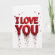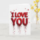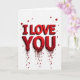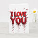 This card shows the words “I LOVE YOU” stacked in the center, with “I LOVE” above “YOU,” all in deep red. The letters look thick and 3D, with beveled edges and soft shadows that make them stand out against a white background. The text is in all caps with a strong, simple letter style, and it’s the main thing you notice right away. At the bottom of the word “YOU,” the red letters break apart into a shower of tiny red hearts. Below that, a few thicker red drips run downward, and each one ends in a small heart shape. It feels like love is spilling over in a way that’s intense but still sweet 🥰. Giving this card can be a meaningful way to say what you feel when you want your words to land clearly and with care ❤️. Hope it helps you share your Valentine’s Day sentiments.