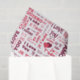 This romantic design features a text pattern of "I Love You" in a variety of languages in fun and modern popular typography decorated with love hearts.