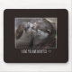Mousepad with a cute and romantic photo with 2 otters in love. One otter is licking the other otter's face, eyes closed looking happy as can be. Text says "I love you like no otter" with a cute doodle heart. Set on a dark brown background.