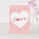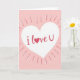 On the front of the card is a large white heart centered on a soft blush pink background. The heart has slightly uneven, drawn-looking edges that make it feel gentle and human. Inside the heart, the text reads “i love U” in a rosy red, textured style that looks a bit like colored pencil. The “o” in “love” is replaced with a small deep pink heart, which adds a sweet little surprise 🥰. Around the big heart, thin broken lines in the same rosy red spread outward like soft rays, with a faint crosshatch look. The simple colors and quiet details make it feel calm, caring, and easy to give to someone you truly like or love ❤️.