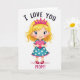 This greeting card shows a smiling young girl standing in the center on a plain white background, holding a big pink heart close to her chest 🥰. Her golden-blonde hair shines softly, and she wears a hot-pink tiara that sits right on top of her head. She has wide blue eyes, rosy cheeks, and a happy expression that feels open and honest. Her dress is turquoise with small white polka dots, finished with a pink ruffle at the bottom, and she has red Mary Jane shoes. At the top, the words “I LOVE YOU” curve overhead in dark, flowing letters, like neat cursive handwriting. At the bottom, “MOM!” appears in dark, thicker all-caps letters, making it clear who the message is for ❤️. It feels meaningful because the simple picture and the big heart say love in a way that’s easy to understand and sweet to receive. Hope it helps you share your Valentine’s Day feelings in a kind, caring way.