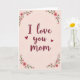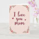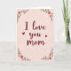 This card shows a soft blush pink background that feels gentle and comforting. In the center, it says “I love you Mom” in flowing maroon lettering that looks like neat cursive, and it’s easy to read. Two small maroon hearts sit on either side of the word “you,” adding a sweet little detail ❤️. In each corner, there are clusters of pink flowers with green stems and leaves that frame the message without crowding it. The flowers look calm and simple, like a quiet bouquet laid around the edges. The whole design feels like a warm thank-you and a close hug, which makes it meaningful to give to your mom 🥰. It’s a thoughtful way to say what you feel when you want your Valentine’s Day feelings to come through clearly and kindly.