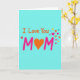 This greeting card features a bright cyan background that makes the message stand out right away. Near the top center, it says “I Love You” in an orange, hand-drawn letter style that feels friendly and sincere 🥰. Just below, the word “MOM” appears much larger in hot pink, centered and easy to read. The “O” in “MOM” is replaced with an orange heart, so the love is shown right inside the word ❤️. White dashed lines trace around the pink “M” letters and the orange heart, like simple stitched detailing. In the upper right area, a cluster of small hearts in pink, orange, yellow, teal, and purple floats upward, adding a light, happy touch. It feels meaningful to give because it says “I love you” clearly and puts your mom at the center of the message.