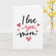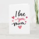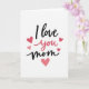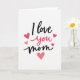 This greeting card shows the message “I love you Mom” centered on a white background, with small hearts floating around it 🥰. The words “I love” and “Mom” are written in thick black lettering that looks like brush strokes, giving it a warm, human feel. The word “you” sits between them in a softer coral pink, and it stands out gently without taking over. Around the text, you’ll see several hearts in two shades of pink—some darker, some lighter—drawn in different sizes. The hearts are scattered loosely so the front feels open and airy, like a little hug on the page. Everything is simple and focused, which makes the message feel direct and easy to mean. It’s a sweet choice for a mom you care about, whether you’re close by or far away ❤️. Hope it helps you share your Valentine’s Day sentiments.