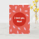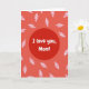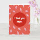 This card centers on the message “I love you, Mom!” placed inside a deep crimson circle. The words are in simple white letters that stand out clearly, sitting right in the middle of the front. Around the circle, the background shifts into lighter reds, moving toward a soft coral tone near the edges. Scattered across that lighter red area are small leaf shapes outlined in pink, with thin white lines inside them like veins. The leaves look like they’re gently drifting, which adds a calm, caring feel to the design. It feels meaningful to give because it says the message plainly while still looking thoughtful and loving 🥰. Share it to pass along Valentine’s Day feelings with a little extra love ❤️.