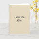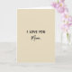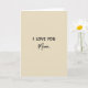 This card shows a simple message of love set on a warm, creamy beige background with a light paper-like texture. Near the top center, the words “I LOVE YOU,” appear in dark charcoal-black, all-caps letters with a straightforward printed look. The ink has a slightly worn texture, like it was pressed onto the paper, which makes it feel honest and real. Just below, the word “Mum” is written in a softer, flowing cursive style in the same dark color, adding a gentle, close-to-home feeling. The contrast between the strong top line and the tender word underneath makes the message feel both clear and caring. The calm background keeps your focus on the words, so it feels like a quiet, direct way to say what matters. It’s a meaningful card to give when you want your mum to feel appreciated, loved, and remembered 🥰❤️.