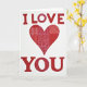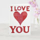 This greeting card shows a big red-and-pink heart centered on a plain white background, made from many small pattern pieces. Above the heart, the text “I LOVE” sits near the top, and below the heart, “YOU” appears near the bottom. The letters are in all caps and look like simple cutout shapes, filled with the same red and pink patterns as the heart. Across the heart and words, you can see white polka dots, thin and wide stripes, and small check patterns mixed together. The heart feels full and sweet, like it’s meant to say “I’m thinking of you” without needing anything else. The bright white space around the design makes the reds and pinks stand out and keeps the focus on the message. It’s a classic love note that feels warm and friendly for Valentine’s Day 💘❤️.