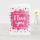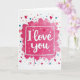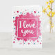 This greeting card puts the words “I love you” right in the center, making the message impossible to miss ❤️. The text is in white, flowing cursive-style lettering, placed inside a hot pink rectangle. A slightly uneven white outline traces around that rectangle, giving it a relaxed, human feel. Behind it, a soft pink cloud shape spreads outward like a splash, with a small drip detail near the bottom edge. Around the main message, you’ll see scattered hearts in deep pink and light blush, plus small teal and magenta dots. The background stays plain white, so all the pinks and little accents stand out clearly. It feels meaningful because it’s simple, direct, and full of warmth—perfect for romance or close friendship 🥰. Hope it helps you share your Valentine’s Day sentiments.