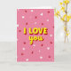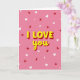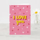 This Valentine's Day card features the big message “I LOVE you” right in the center. “I LOVE” is written in all caps in bright yellow letters with a dark red shadow behind them, giving the words a slightly raised look. The word “you” sits just below in a looser, cursive-style lettering that feels softer and more personal. The background is bubblegum pink, covered with a scattered pattern of tiny white hearts and small red X marks that suggest hugs and kisses. Everything feels upbeat and affectionate, like a simple, direct way to say what’s in your heart. It’s meaningful because it doesn’t overthink it—just a clear “I love you” that can fit romance or close friendship 🥰. Share it to help someone feel loved this Valentine’s Day ❤️.