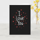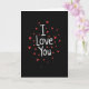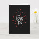 This greeting card centers on the words “I Love You” in white, hand-drawn lettering, placed right in the middle. The letters look a bit uneven in a sweet, human way, which makes the message feel honest and close ❤️. Behind the text is a solid black background that makes the white words stand out right away. Small red hearts are scattered around the message, like they’re floating in the space around it 💘. The hearts vary slightly in size and angle, giving the front a lively, affectionate feel without looking busy. With just black, white, and red, the design keeps things simple while still feeling romantic and direct. It’s an easy card to give to a partner or close friend when you want your feelings to be clear.