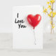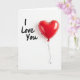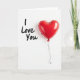 This greeting card shows a shiny red heart-shaped balloon on the right side against a plain white background. The balloon looks metallic and reflective, with light glinting off it and a soft shadow nearby that makes it feel real. A thin black string hangs down from the balloon, like it’s gently floating in place. On the left, the words “I Love You” appear in black, written in a flowing handwritten style. The simple layout makes the message easy to notice right away, and the red heart feels warm and close ❤️. It’s a meaningful card to give because it says exactly what you feel without needing anything extra 🥰.