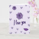 This card shows a lavender background with deeper plum details that give it a calm, romantic look. In the center, the text “I love you” appears in rich purple, written in a flowing, cursive-style lettering that stands out clearly. On either side of the words are two purple roses with outlined petals and soft shading, like a simple illustration. Small muted-lavender hearts are scattered all over the card, floating around the main message and adding a gentle feeling. In the bottom right corner, there’s a pair of plump purple lips, like a little kiss tucked into the design. The overall scene feels quiet and affectionate, like a note you’d give when you want your feelings to be clear without saying too much. It’s meaningful because it combines a direct message with soft symbols of love—roses, hearts, and a kiss 🥰❤️. Hope it helps you share your Valentine’s Day feelings in a warm way.