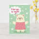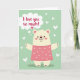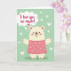 This greeting card features a cute, bear-like character in a soft creamy color, standing front and center with open arms that feel like a gentle hug ❤️. Its simple face shows closed eyes, rosy cheeks, and a wide smile that suggests a tender, affectionate mood. The character wears a bright pink tunic covered with small white stars, adding a sweet, cozy touch. Above its head floats a white, cloud-shaped thought bubble with a red heart inside, as if the character is daydreaming about someone special. Inside the bubble, the text “I love you so much!” appears in red lettering, placed prominently so it’s easy to read at a glance. The background is a pastel mint-green field that keeps the scene calm and friendly, with scattered tiny white hearts drifting upward like little notes of affection 🌼. The overall look is flat and simple with minimal shading, and the small white hearts are sprinkled across the mint backdrop around the character.