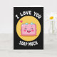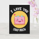 This greeting card shows a pink bar of soap with a big smile, eyes squeezed shut, and rosy cheeks, like it’s laughing with happiness. A golden-yellow circle sits behind the soap like a glowing spotlight, making the character stand out. A few small blue bubbles float above it, and a tiny pink heart hovers nearby to add a romantic touch 💘. The background is deep black, which makes the pink, yellow, blue, and white colors easy to notice. At the top, the card says “I LOVE YOU” in white, simple sans-serif letters that curve over the picture. At the bottom, it reads “SOAP MUCH” in the same white, simple sans-serif letters, turning the message into a sweet joke ❤️. It feels light, affectionate, and a little silly in the best way, perfect for someone you care about 😘.