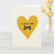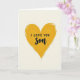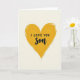 This card shows a large mustard-yellow heart taking up most of the front, set on a creamy off-white background. The heart looks like it was painted with visible brush marks, so the edges are slightly uneven and full of texture. Near the center of the heart, the words “I LOVE YOU Son” are written in charcoal black. “I LOVE YOU” appears in simple, straight lettering on the top line, while “Son” sits underneath in a smooth, flowing cursive style. A few small paint drips hang near the bottom point of the heart, adding a real, human touch. The warm yellow color and direct message make it feel like an honest way to show love and appreciation, whether from a parent or someone who cares deeply. It’s a simple design, but it still feels emotional and close-to-the-heart 🥰❤️, perfect for sharing Valentine’s Day sentiments.