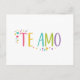 I love you in Spanish, te amo, in fun rainbow colors decorated with little hearts and circles.