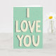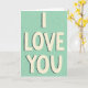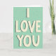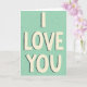 This greeting card features the words “I LOVE YOU” stacked in three lines down the center, making the message the main focus. The background is a muted mint green that feels calm and gentle. The letters are off-white, like light cream, and they have a slightly uneven edge that makes them feel more human and less perfect. A darker teal shadow sits just behind the letters, giving them a bit of depth without looking heavy. Across both the background and the text, there are scattered speckles in white, black, and deep teal, like a lightly worn print. The text is made of thick, simple letters and is easy to read from a distance, with “I” on top, “LOVE” in the middle, and “YOU” at the bottom. It’s a straightforward way to say something big, perfect for a partner or someone close 💘❤️, and it’s ready for sharing Valentine’s Day sentiments.