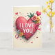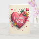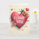 This Valentine's Day card shows a puffy red heart in the middle on a soft cream background. Across the heart, the words “I LOVE YOU” appear in white letters with a slight shadow, making them stand out clearly. The heart is covered with tiny sprinkles like little stars, dots, and small round pieces in light pastel colors. Pink ribbon loops wrap around the heart like it’s a gift, and there are simple flowers nearby with pink, yellow, and blue petals and green leaves. Small red hearts and scattered colorful dots float around the scene, with a few following curved dotted paths that suggest movement and excitement. The overall look feels sweet, warm, and romantic, with gentle shading that gives the heart a raised, 3D feel. It’s a cheerful way to say “I love you” and share a little extra affection on Valentine’s Day 💘❤️.