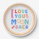 I love you to the moon and back round paper plate with an orange border. What a fun and colorful paper plate for celebrating a special occasion.
