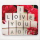 I Love You message with wooden tiles with a Joy word reflected in a mirror.