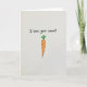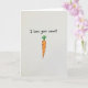 This greeting card pairs a simple illustration with a sweet, flirty pun on an off-white background. Near the top, the phrase “I love your carrot” appears in thick black lettering, centered and easy to read, with a light, teasing tone that suggests a close bond. Below the text, a single carrot sits in the middle like a little love token, as if offered with a shy grin 🐰. The carrot is outlined in heavy black lines, widening at the top and narrowing to a pointed tip, giving it a neat, stylized shape. Its body is filled with a bright orange color, while the leafy top fans out in fresh green, adding a garden-fresh contrast 🌷. Small black dash marks run across the orange surface to suggest natural ridges and texture without cluttering the design. The carrot’s green fronds spread upward in several curved spikes, each edged in black against the pale background.