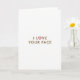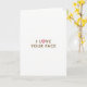 This greeting card keeps things simple with the message “I LOVE YOUR FACE” centered on a plain white background. The words are in brown, all-caps block letters, and they sit right in the middle of the card for an easy-to-read look. Instead of the “O” in “LOVE,” there’s a heart symbol in pink and red that stands out right away. The heart has a brighter outline and a softer pink center, giving it a sweet, glossy feel. With no other objects or scenery, the empty white space puts all the attention on the message and the little heart. The overall look feels warm, direct, and affectionate—great for romance or close friendship. It’s a quick, honest note that says a lot with just a few words ❤️💌🍫. Hope it helps you share your Valentine’s Day feelings with someone you care about.