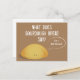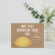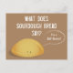 A postcard that features a bread joke. The design asks “What does sourdough bread say?” And then the illustrated bread loaf below says “I’m a self-starter!” The postcard’s color scheme is brown and white.