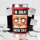 Embrace the chaos with caffeine. This thermal tumbler features a frazzled cartoon face and the all-too-relatable phrase **“I’M OKAY WITH THIS”**, all printed over a rich, darker red background.