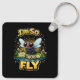 A cheerful cartoon fly with oversized red eyes stands proudly on a lily pad beneath a sparkling night sky, celebrating humor, confidence, and playful charm.
