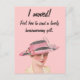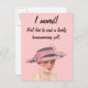 This new home postcard features a vintage image of a well dressed woman in a pink hat, on a pink background. The text reads, "I moved! Feel free to send a lovely housewarming gift". The background color, and all the text, can be customized as desired.