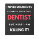 I Never Dreamed I'd Become A Super Cool Dentist But Here I Am Killing It design. This is a short funny quote which is great as an appreciation gift idea for Dentists. Also suitable as Dentist Gifts.