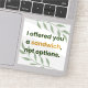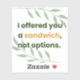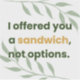 Add a slice of sass to your laptop, water bottle, journal, or wherever you want with this bold and witty vinyl sticker! Featuring the hilarious phrase “I offered you a sandwich, not options,” this sticker is perfect for anyone who loves straightforward humor with a side of sarcasm.
