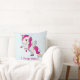 A pillow with a funny saying: I poop magic. Designed with a white winged unicorn with pink mane, tail and hooves. The horn has rings of rainbow color and looks like a candy lollipop. This cute unicorn is rearing up on its back legs. Sweet pink heart on its cheek and long girly eyelashes. A colorful rainbow beside the word magic.