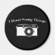 Simple fridge magnet design with quote 'I Shoot Pretty Things'. This is a retro design featuring hand drawn camera. This is for anyone who are passionate in photography, whether you're professional or beginner this is a great statement for your passion. Available in different designs and colors.