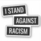 Stickers featuring white text "I stand against racism" on a black background