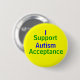 Yellow button with green and blue: I Support Autism Acceptance