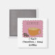 Cool pink coffee sign with a mug of steaming coffee and a few loose beans beside it. A fun saying for a teacher, "I teach Therefore, I need coffee"