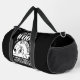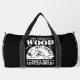 This black duffle bag is perfect for woodworkers and crafters, declaring "I TURN WOOD INTO THINGS" and asking "WHAT'S YOUR SUPERPOWER?" The design features a hammer, saw, and other tools, making it an ideal gift for anyone who loves creating with wood. Edit color of the bag caps and body in the Design tool to your favored colors.