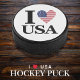 Show your love for both hockey and the United States with this "I ❤️ USA" hockey puck. Featuring a bold design of the American flag shaped into a heart, this regulation-size puck is perfect for game play, display, or as a unique patriotic collectible. It's an ideal gift for hockey fans, military members, or anyone who wants to combine their passion for the sport with their national pride. Add it to your collection or use it on the ice!