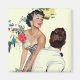 Artist:Joe DeMers | Woman in a zebra striped dress and red flower pin leaning over in a chair talking to a man in a white suit