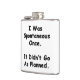 This small flask is really cute. Good for taking water or other liquids with you. My only complaint is the top is somewhat difficult to get back on after you screw it off. The printing is really good on the flask. My design came out just right!
