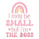 The image features a white children's t-shirt with a playful and colorful design. The design includes a rainbow and the phrase "I may be SMALL but I'm THE BOSS" in pink and red text, accented with small heart shapes. This t-shirt is likely intended for young children and conveys a fun and confident message.
