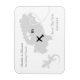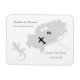 Stylish destination wedding save the date magnet card for couples getting married in Ibiza. With gecko lizard symbol, a silver gray silhouette map and white love hearts. Very pretty and easy to customize with your personal details.