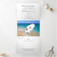 Modern tri-fold wedding invitation for couples getting married in Ibiza one of the beautiful Spanish Balearic Islands which is shown in a a map silhouette on a sandy beach scene. The invitation has a cut off RSVP section and is easy to customize with your own wedding details and personal photo at no extra cost.