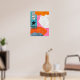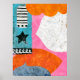 Ice Cream Afternoon is a colorful mixed media collage piece in large chunky shapes of orange, blue and white over pink. Stripes, dots and a star in black and white bring modern accents to this cute, fun print.