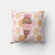 A double decker ice cream cone with chocolate and pink ice cream on a background of melon, pink, and lavender big polka dots.