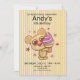 Features cute brown bear holding colorful yummy Ice cream cone with stars, champagne gold colors striped pattern background with beautiful typography. Personalize it with your details.